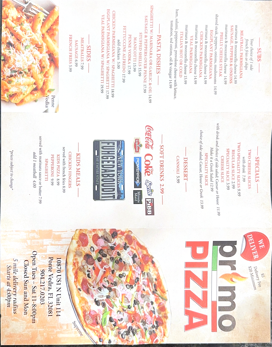 Welcome to Primo Pizza - Ponte Vedra Beach, where the essence of New York meets the beaches of Florida. This charming pizzeria offers an enticing menu that showcases classic Italian delights, starting with tempting appetizers like gooey mozzarella sticks and crispy garlic knots, perfect for sharing. The calzones are customizable, allowing you to create a savory pocket of flavor with your choice of toppings.
